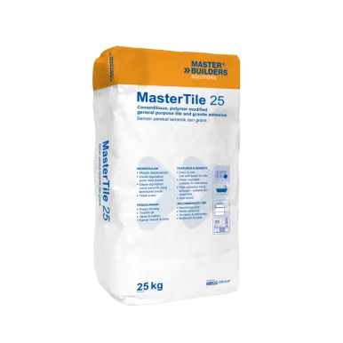 MasterTile 25 adalah bubuk semen abu-abu yang mengandung polimer peningkat kinerja dan aditif khusus lainnya. Perekat berbahan dasar semen yang serbaguna dan mudah ditangani ini sangat cocok untuk memasang ubin keramik, ubin tambang, dan bahan serupa. Ini memberikan daya rekat yang kuat pada screed semen / pasir, ke beton in-situ / pracetak dan aerasi, dan batu bata. Untuk aplikasi dinding eksternal gunakan MasterTile 30
